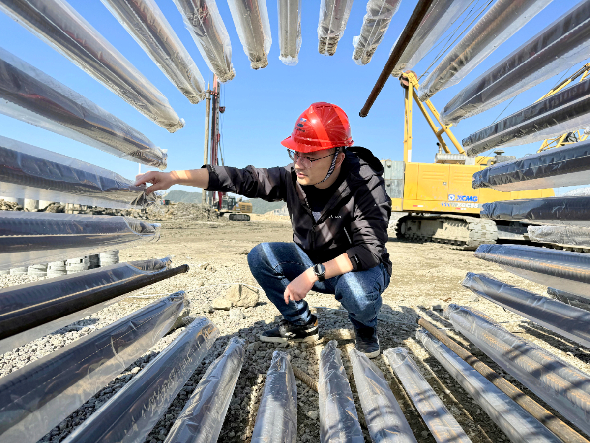 浙江浙能六橫液化天然氣有限公司員工嚴捷正在認真檢查鋼筋籠制作及成品保護。 周志南 攝