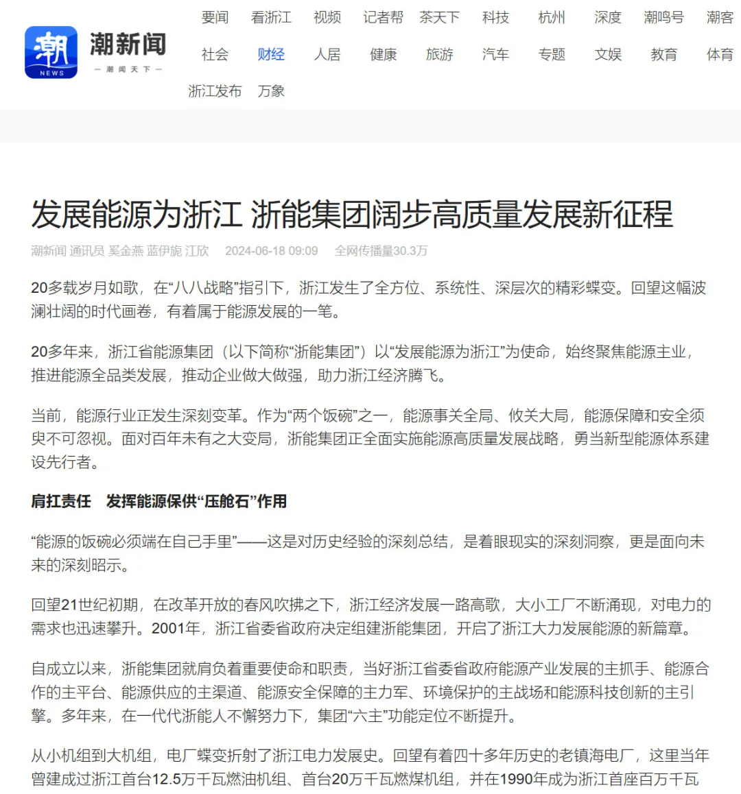 6月18日,“潮新聞”客戶端報道《發展能源為浙江 浙能集團闊步高質量發展新征程》。