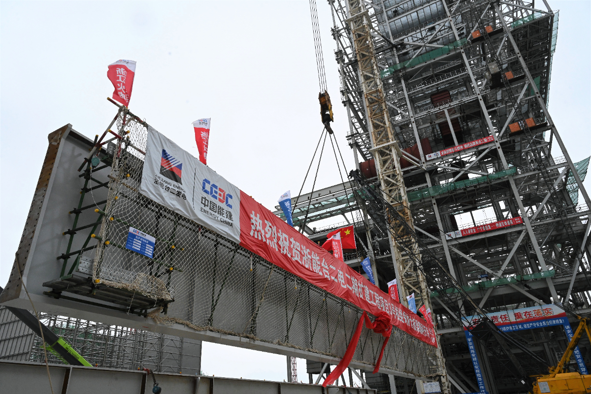 臺(tái)二電二期3號(hào)鍋爐首根大板梁吊裝就位。 俞琬 提供