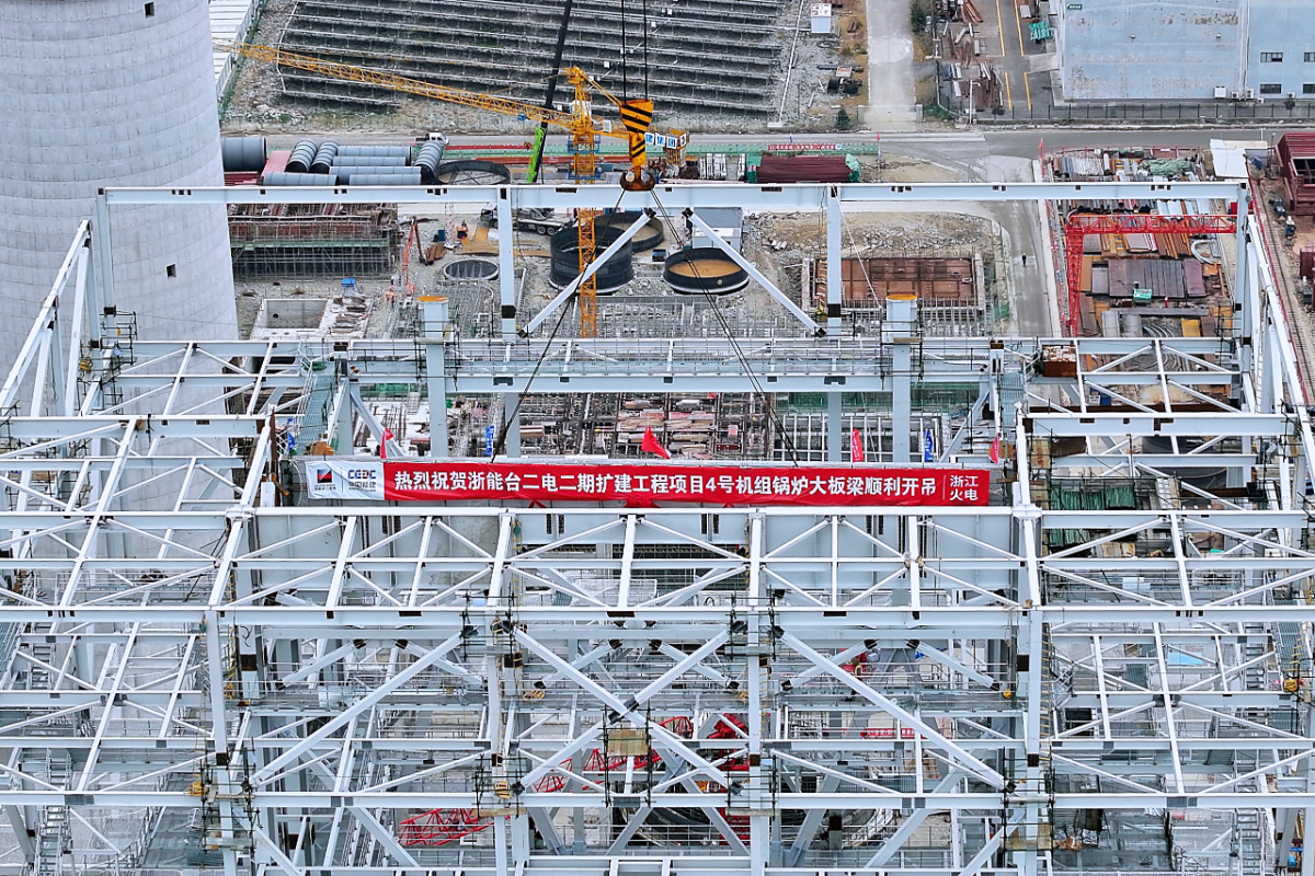 高質量發展看“浙”里|臺二電二期擴建工程項目4號鍋爐首根大板梁吊裝就位