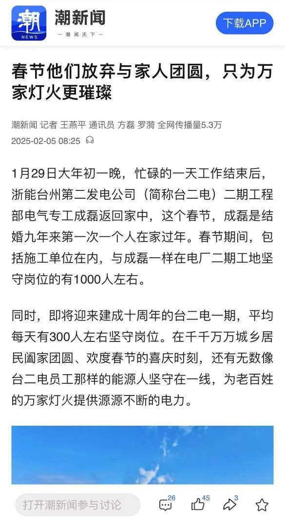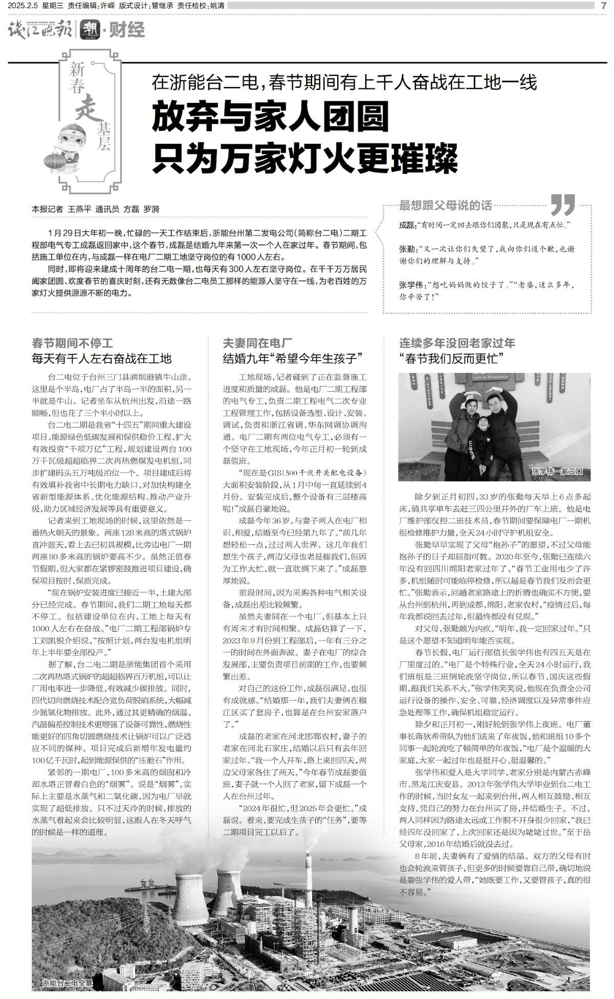 編者按:春節(jié),是闔家團圓的日子,是歡聲笑語的時刻。然而,在這萬家燈火的背后,有一群浙能人,他們放棄了與家人團聚的溫馨,選擇堅守崗位,用責任和擔當守護著節(jié)日的溫暖與光明。2月5日,《錢江晚報》整版報道浙能臺二電春節(jié)期間上千人奮戰(zhàn)在工地一線。