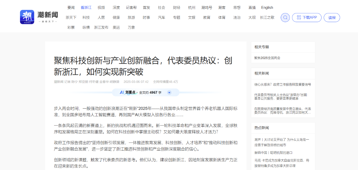 潮新聞報(bào)道《聚焦科技創(chuàng)新與產(chǎn)業(yè)創(chuàng)新融合,代表委員熱議——?jiǎng)?chuàng)新浙江,如何實(shí)現(xiàn)新突破》。 潮新聞客戶(hù)端 圖