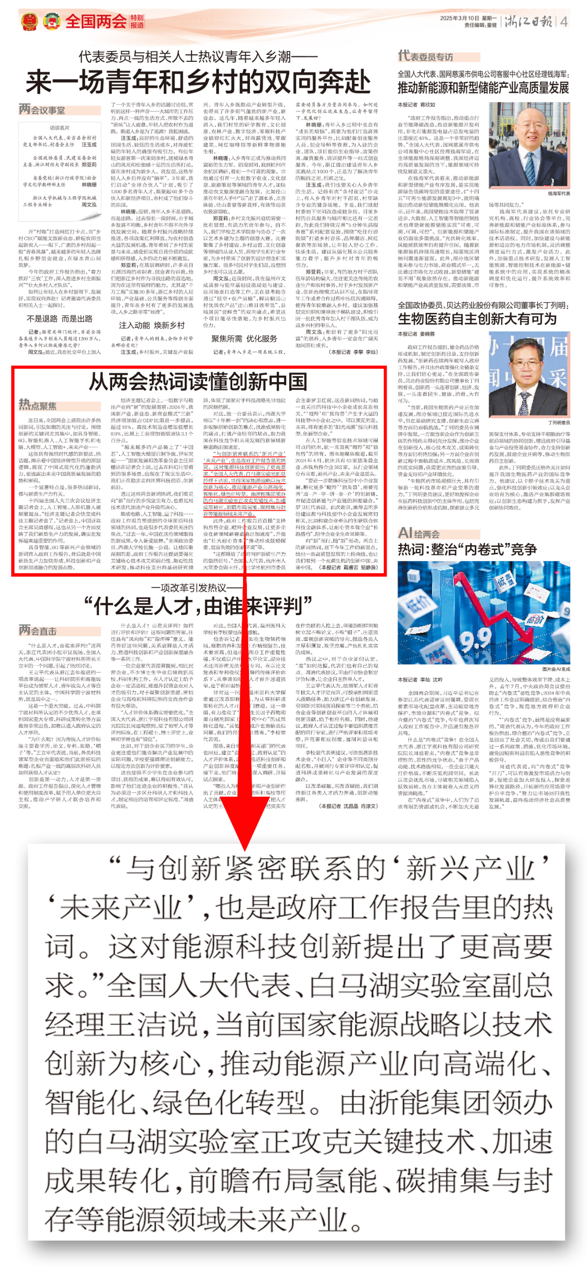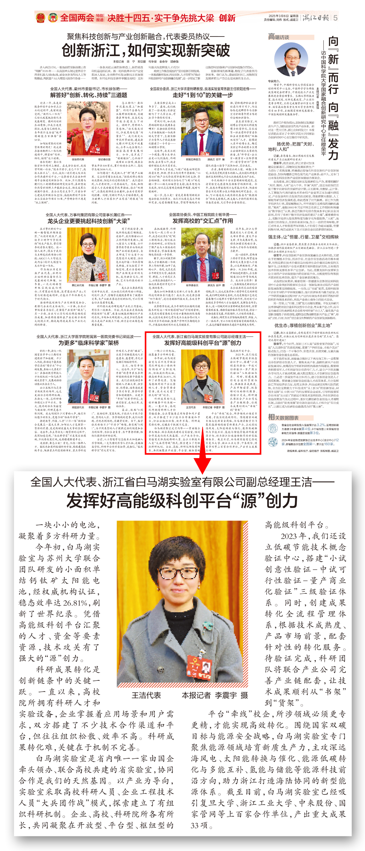 《浙江日?qǐng)?bào)》全國(guó)兩會(huì)特別報(bào)道《全國(guó)人大代表、浙江省白馬湖實(shí)驗(yàn)室有限公司副總經(jīng)理王潔——發(fā)揮好高能級(jí)科創(chuàng)平臺(tái)“源”創(chuàng)力》。 浙江日?qǐng)?bào) 圖