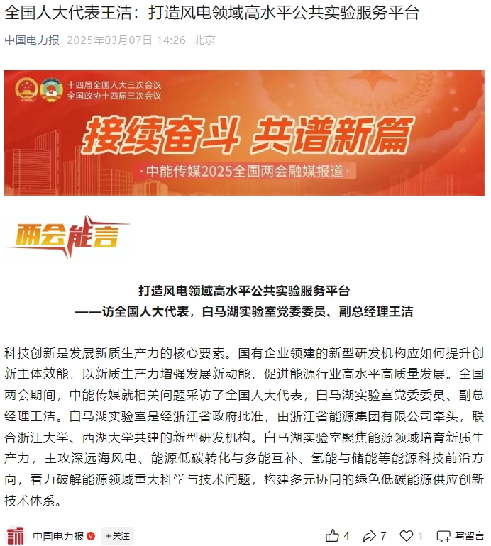 《中國(guó)電力報(bào)》微信公眾號(hào)報(bào)道《全國(guó)人大代表王潔:打造風(fēng)電領(lǐng)域高水平公共實(shí)驗(yàn)服務(wù)平臺(tái)》。 中國(guó)電力報(bào)微信公眾號(hào) 圖