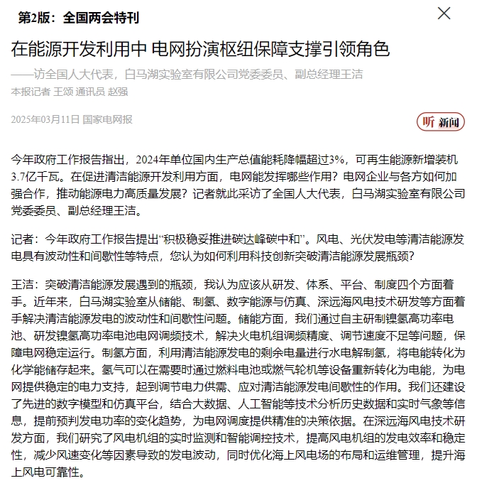 《中國(guó)電力報(bào)》報(bào)道《全國(guó)人大代表王潔:打造風(fēng)電領(lǐng)域高水平公共實(shí)驗(yàn)服務(wù)平臺(tái)》。 中國(guó)電力報(bào) 圖