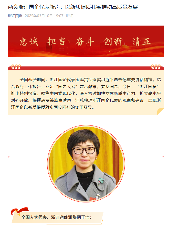 “浙江國(guó)資”微信公眾號(hào)報(bào)道《兩會(huì)浙江國(guó)企代表新聲:以新質(zhì)提質(zhì)扎實(shí)推動(dòng)高質(zhì)量發(fā)展》。 浙江國(guó)資 圖