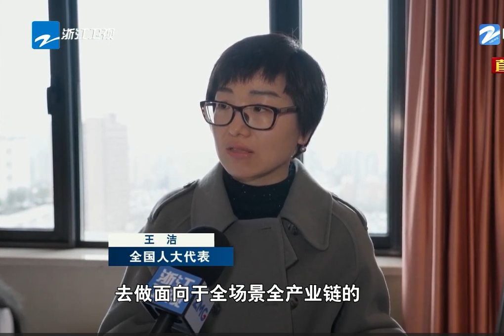 浙江衛(wèi)視《浙江新聞聯(lián)播》報(bào)道《直通全國(guó)兩會(huì) 出席十四屆全國(guó)人大三次會(huì)議的浙江代表團(tuán)抵京》,采訪(fǎng)王潔同志。 浙江衛(wèi)視《浙江新聞聯(lián)播》 圖