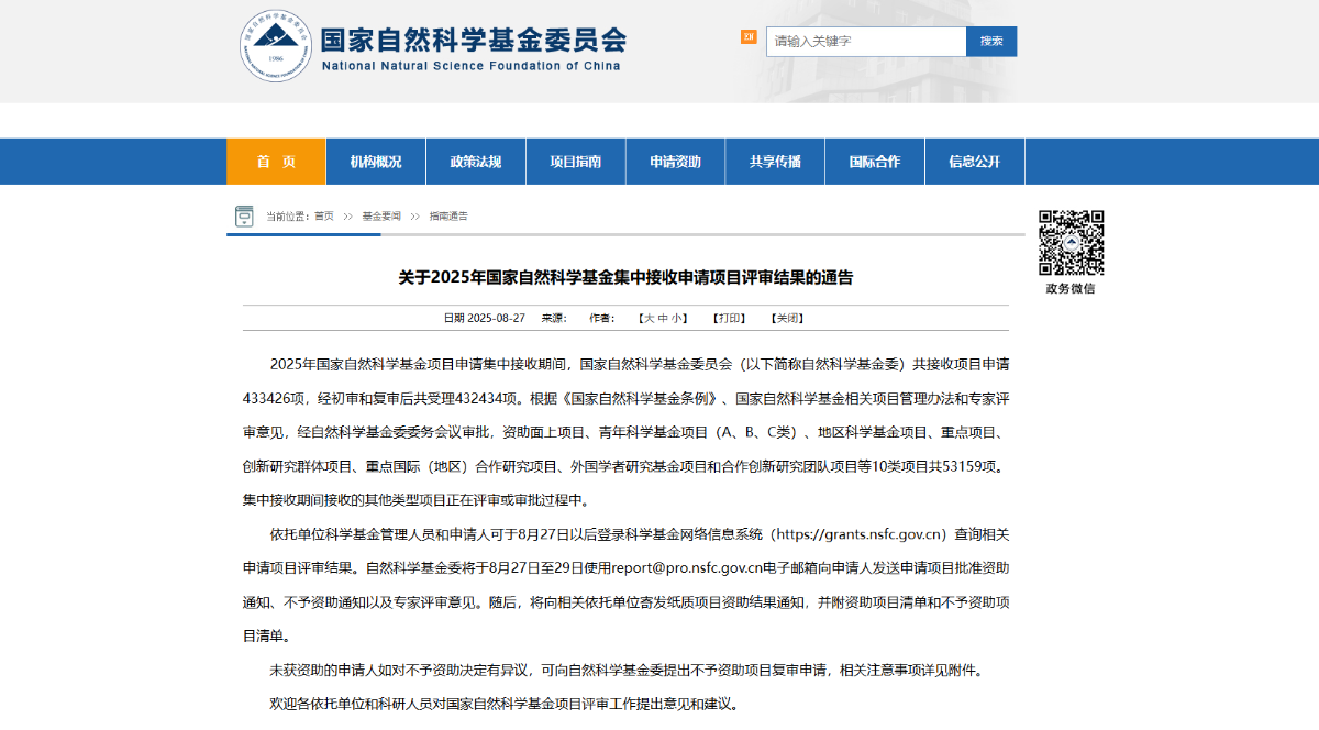 《關于2025年國家自然科學基金集中接收申請項目評審結果的通告》 國家自然科學基金委員會 圖