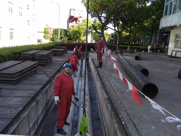 在管道施工現(xiàn)場(chǎng),紛紛拉起了安全警戒線。轟鳴的吊機(jī)啟動(dòng)聲,紅色連體服四處都是,一塊塊沉重的蓋板被吊起,堆放在一處。撬棒、打水泵、手拉葫蘆、吊繩、扣環(huán)等工作器具擺放得整整齊齊,這場(chǎng)管道翻身的“節(jié)能戰(zhàn)”有條不紊地進(jìn)行著。