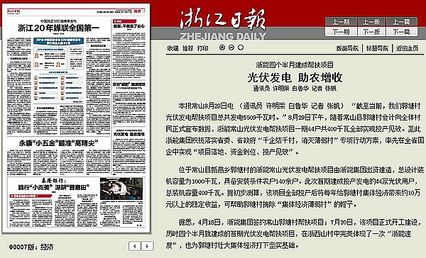 “截至當(dāng)前,我們郭塘村光伏發(fā)電幫扶項(xiàng)目總共發(fā)電5509千瓦時。”8月29日下午,隨著常山縣郭塘村會計向全體村民正式宣布數(shù)據(jù),浙能常山光伏發(fā)電幫扶項(xiàng)目一期44戶共409千瓦全部實(shí)現(xiàn)投產(chǎn)見效。至此浙能集團(tuán)積極落實(shí)省委、省政府“千企結(jié)千村,消滅薄弱村”專項(xiàng)行動方案,率先在全省國企中實(shí)現(xiàn)“項(xiàng)目落地、資金到位、投產(chǎn)見效”。