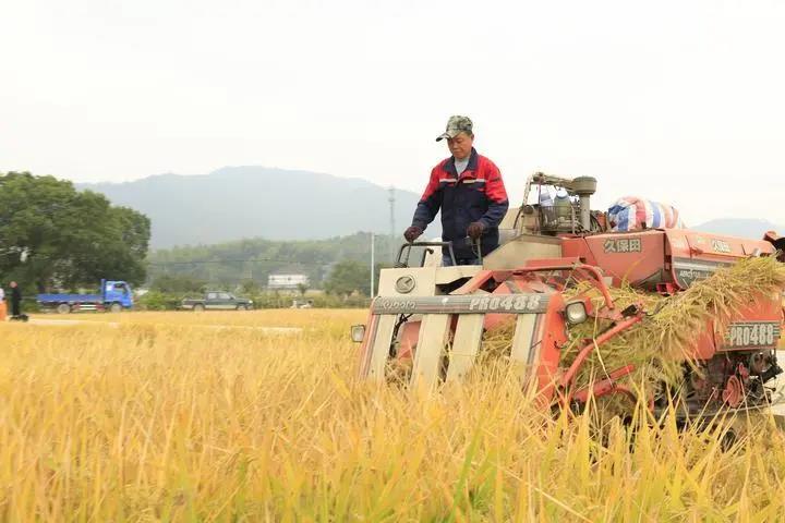 10月14日,浙能長(zhǎng)廣集團(tuán)煤山區(qū)域5號(hào)復(fù)墾地塊,農(nóng)戶正駕駛收割機(jī)割稻。