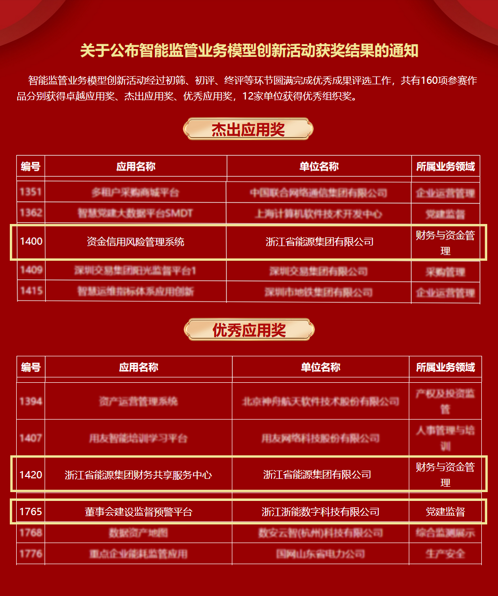 近日,國(guó)務(wù)院國(guó)資委2023年智能監(jiān)管業(yè)務(wù)模型創(chuàng)新活動(dòng)獲獎(jiǎng)名單揭曉,浙能集團(tuán)《資金信用風(fēng)險(xiǎn)管理系統(tǒng)》榮獲“杰出應(yīng)用獎(jiǎng)”,《財(cái)務(wù)共享服務(wù)中心》《董事會(huì)建設(shè)監(jiān)督預(yù)警平臺(tái)》榮獲“優(yōu)秀應(yīng)用獎(jiǎng)”。
