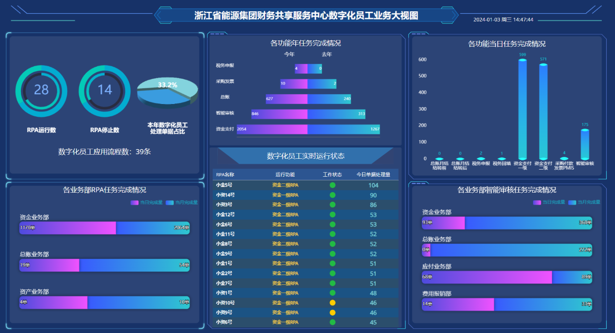 浙能財(cái)務(wù)共享運(yùn)營(yíng)平臺(tái)上線以來(lái)已推廣21批線上運(yùn)行427家單位,開(kāi)發(fā)129支標(biāo)準(zhǔn)化流程,與SAP等20個(gè)業(yè)財(cái)系統(tǒng)實(shí)現(xiàn)集成,覆蓋用戶3萬(wàn)余人,從無(wú)到有打造以智能化、流程和數(shù)據(jù)驅(qū)動(dòng)、業(yè)財(cái)稅資檔一體貫通、財(cái)務(wù)風(fēng)險(xiǎn)控制和財(cái)務(wù)人才培養(yǎng)為主,富有浙能特色、不斷迭代升級(jí)、賦能價(jià)值創(chuàng)造的財(cái)務(wù)共享金名片,走在浙江國(guó)資國(guó)企前列。在數(shù)智化方面,該平臺(tái)采用統(tǒng)一架構(gòu)的端到端數(shù)字化平臺(tái),利用IPA智能流程自動(dòng)化、OCR智能審核、AI、NLP自然語(yǔ)言處理、全場(chǎng)景遠(yuǎn)程辦公等先進(jìn)技術(shù)手段,搭建起流程、審核、運(yùn)營(yíng)和數(shù)治四個(gè)方面組成的智能應(yīng)用體系,實(shí)現(xiàn)憑證和支付自動(dòng)化率雙雙超過(guò)99%,其中數(shù)字員工、數(shù)字化監(jiān)督看板、智能語(yǔ)音提單、智能派單、智能客服等一批功能應(yīng)用頗具特色、業(yè)內(nèi)領(lǐng)先,榮獲上國(guó)會(huì)“2022年智能財(cái)務(wù)最佳實(shí)踐年度綜合大獎(jiǎng)”。