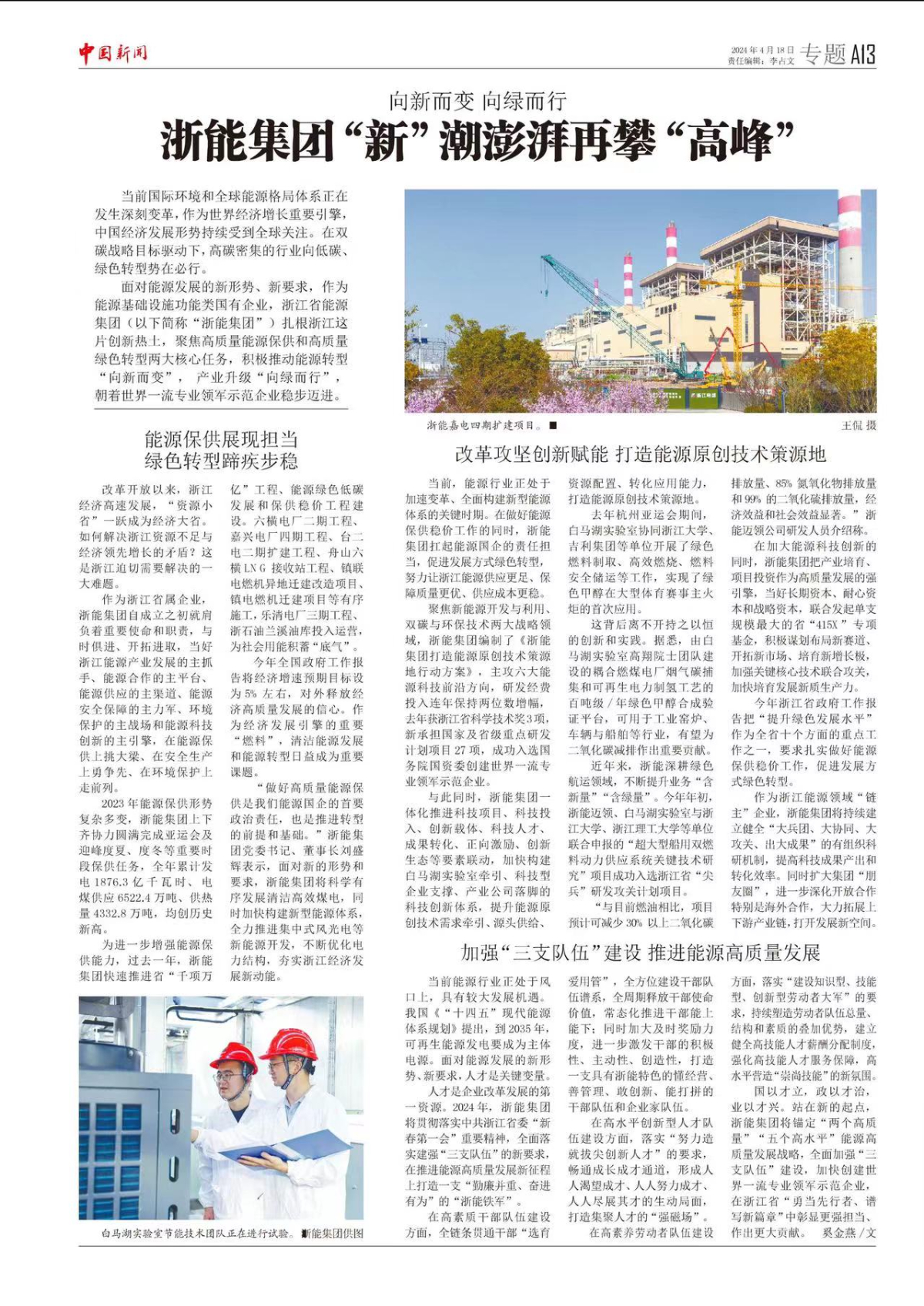 中國新聞網(wǎng)報道《浙能集團“新”潮澎湃再攀“高峰”》。 羅漪 提供