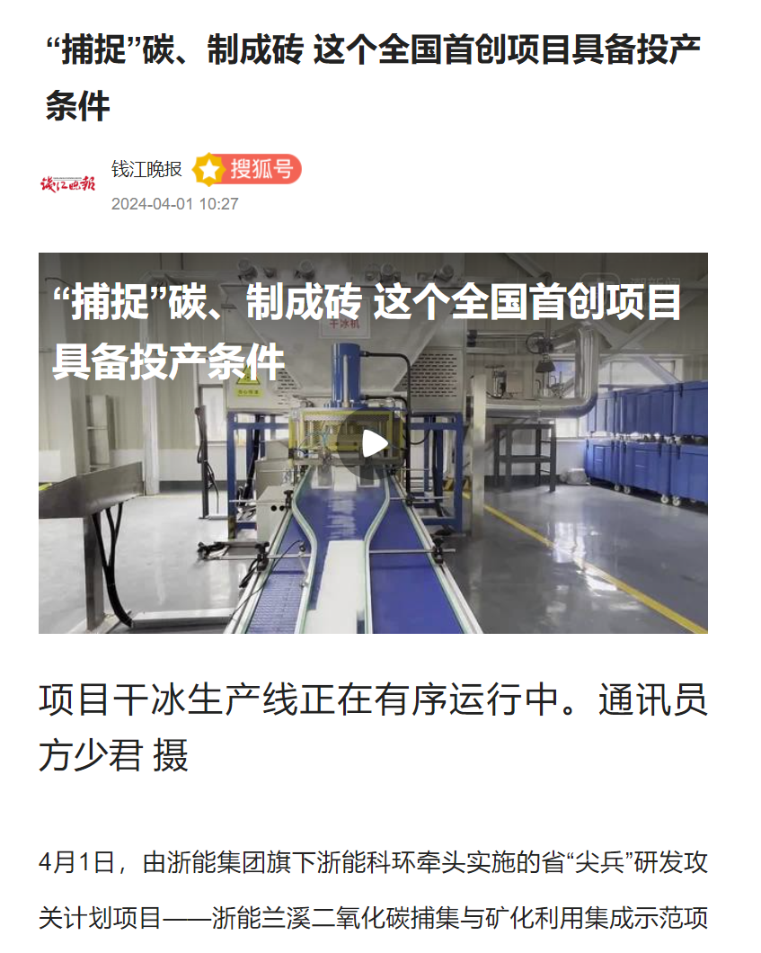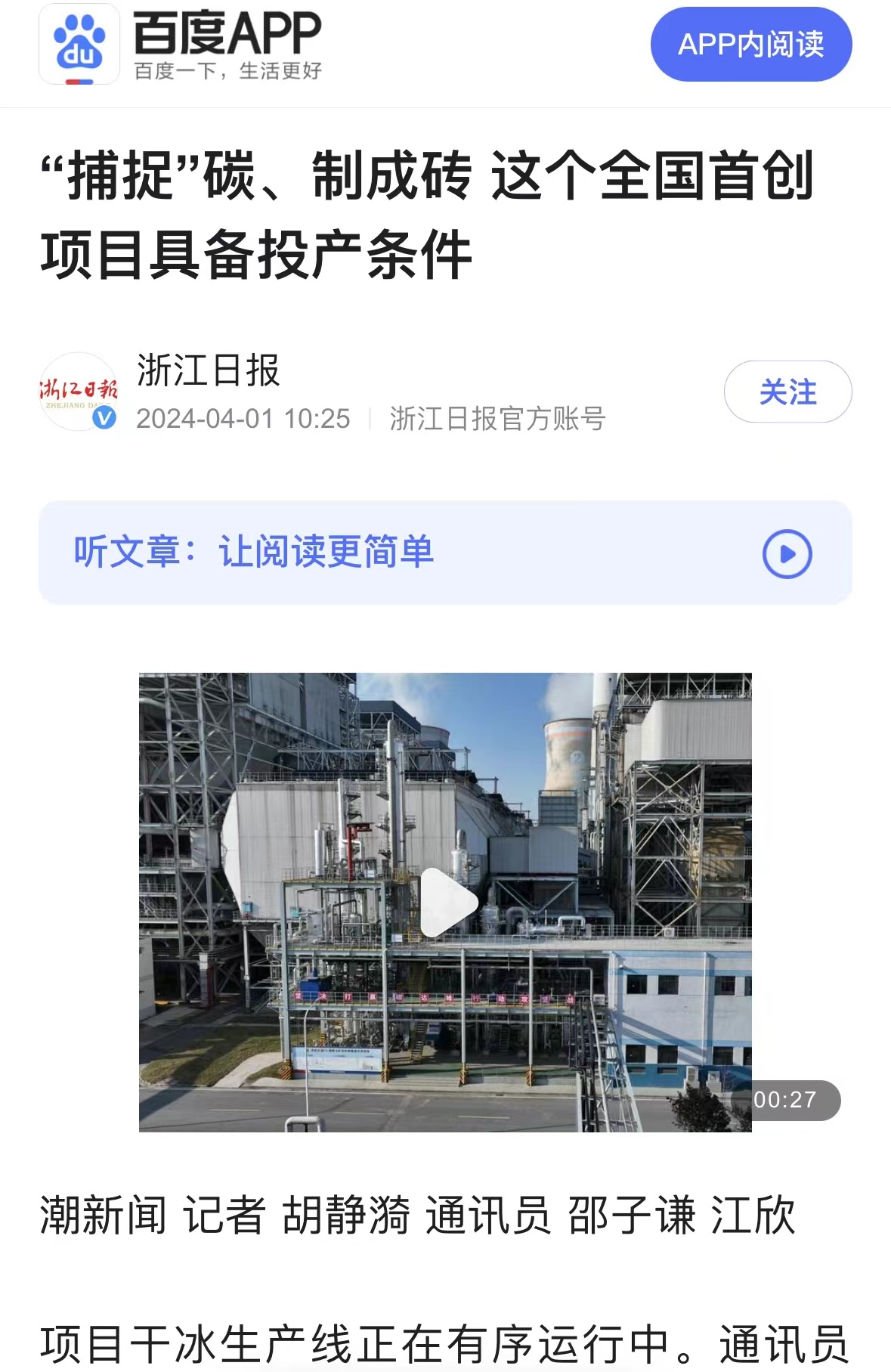 4月1日,浙江日報百度百家號轉載報道《“捕捉”碳、制成磚 這個全國首創項目具備投產條件》 百度百家號 圖