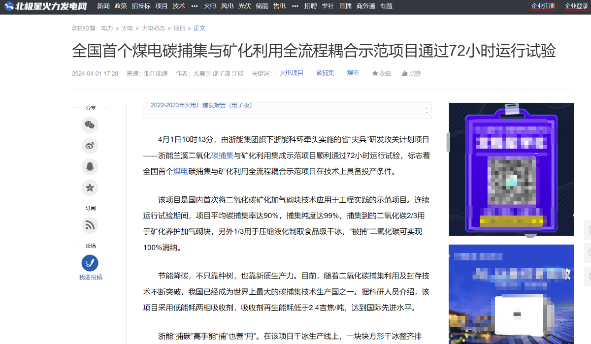 4月1日,北極星火力發電網轉載報道《全國首個煤電碳捕集與礦化利用全流程耦合示范項目通過72小時運行試驗》。 北極星火力發電網 圖