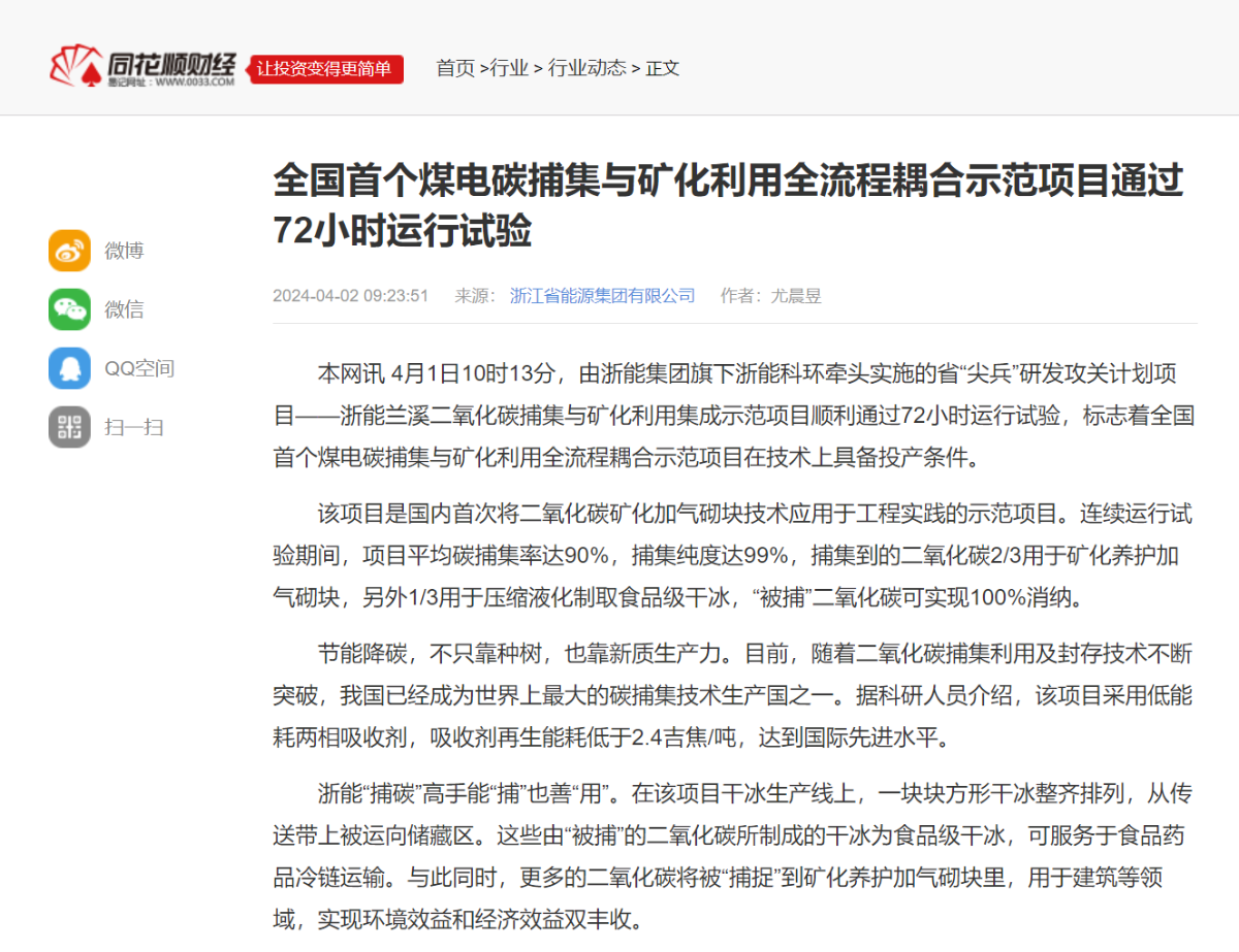 4月2日,同花順財經報道《全國首個煤電碳捕集與礦化利用全流程耦合示范項目通過72小時運行試驗》。 同花順財經 圖