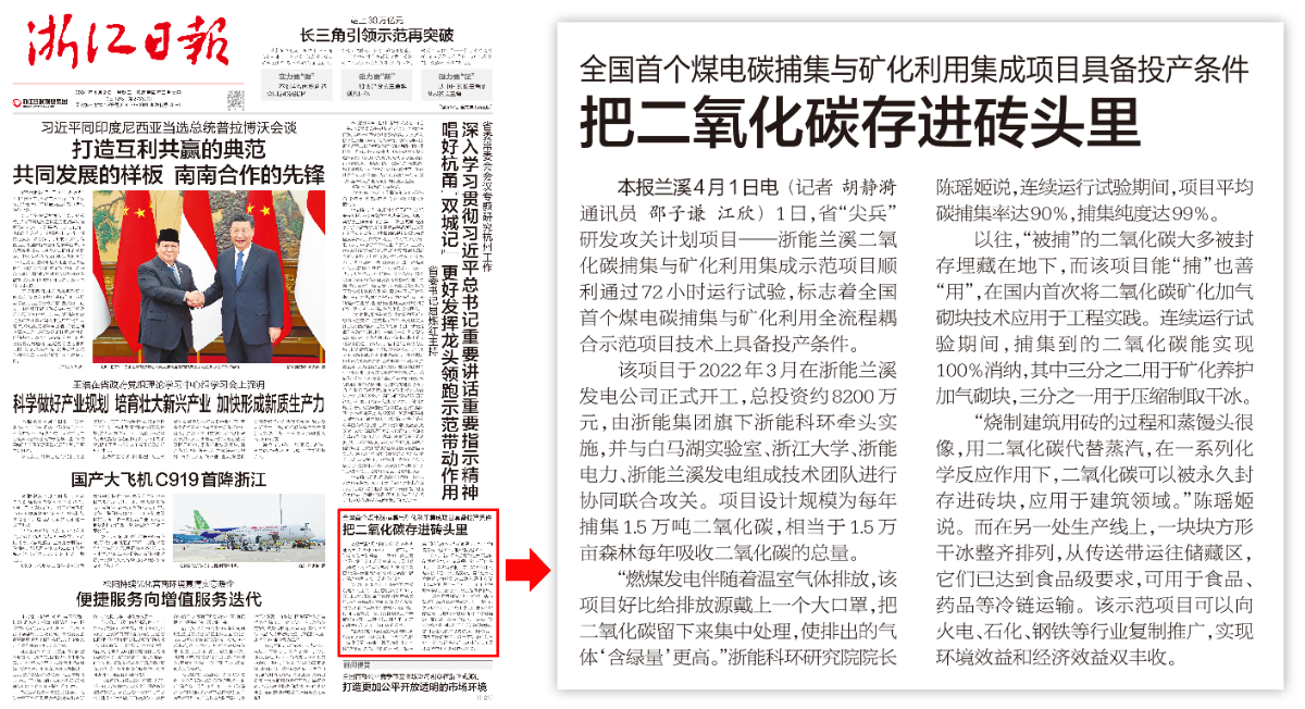 4月2日,《浙江日報》頭版刊登浙能新聞《全國首個煤電碳捕集與礦化利用集成項目具備投產條件 把二氧化碳存進磚頭里》。 浙江日報 圖