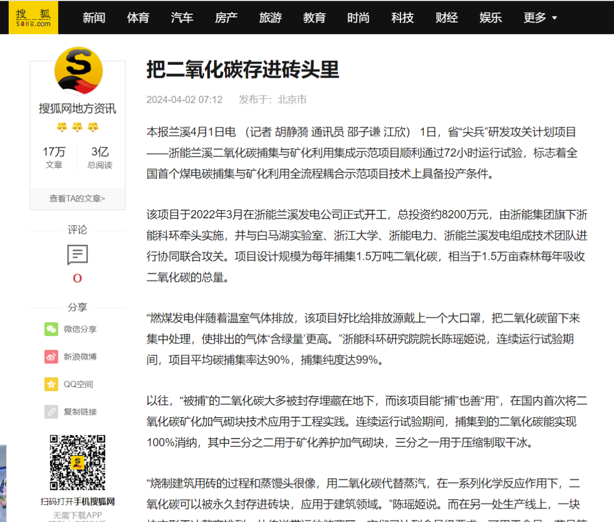 4月2日,搜狐網轉載報道《把二氧化碳存進磚頭里》。 搜狐網 圖