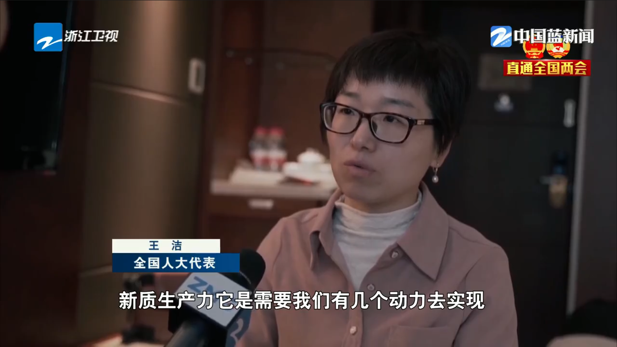 浙江衛(wèi)視《浙江新聞聯(lián)播》報(bào)道《直通全國(guó)兩會(huì)·履職新聲音 王潔:讓科研與生產(chǎn)力雙向奔赴》。 浙江衛(wèi)視 圖