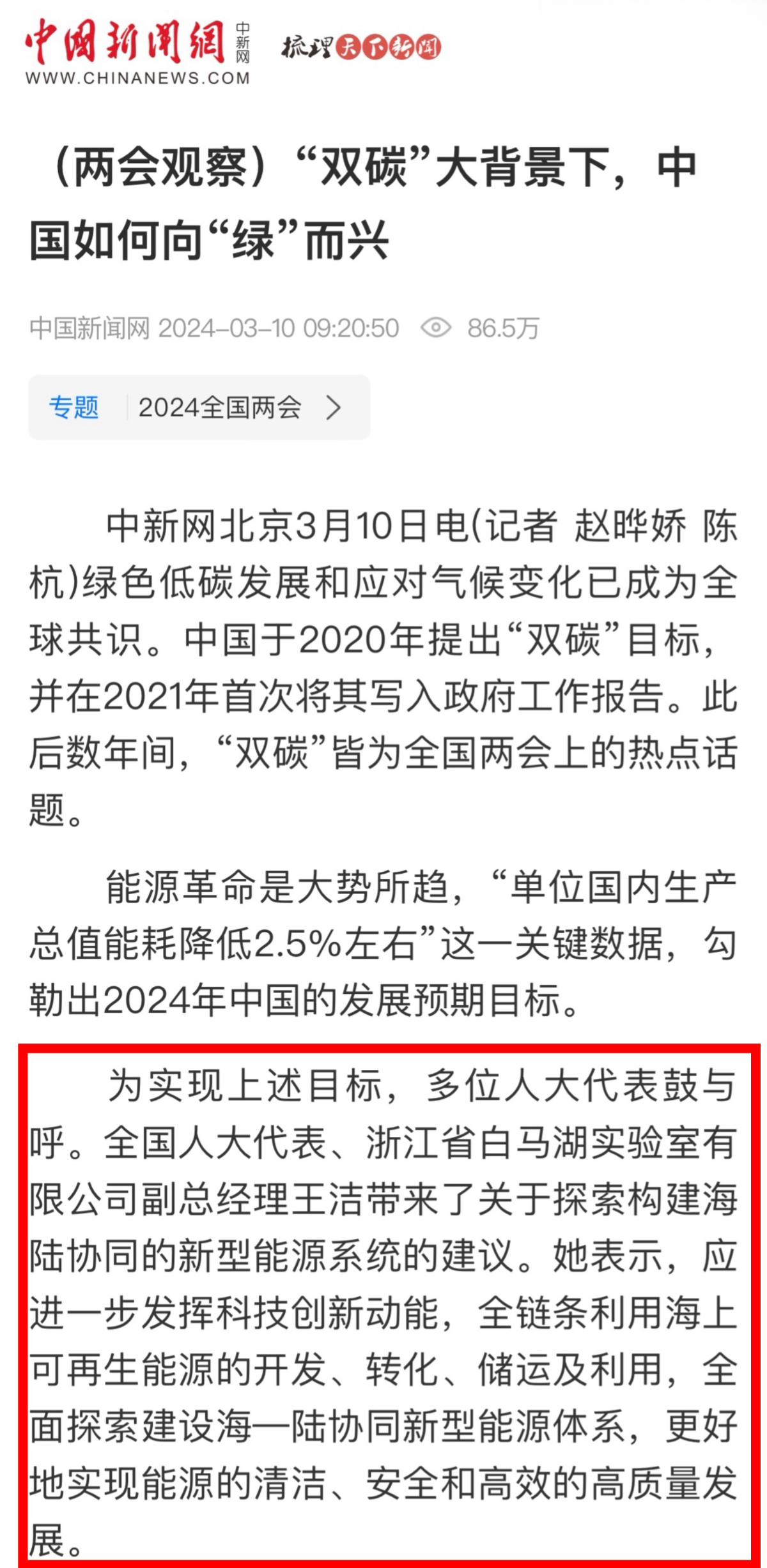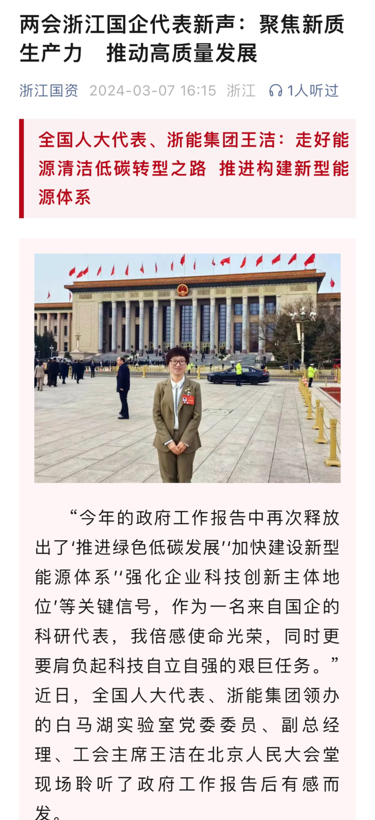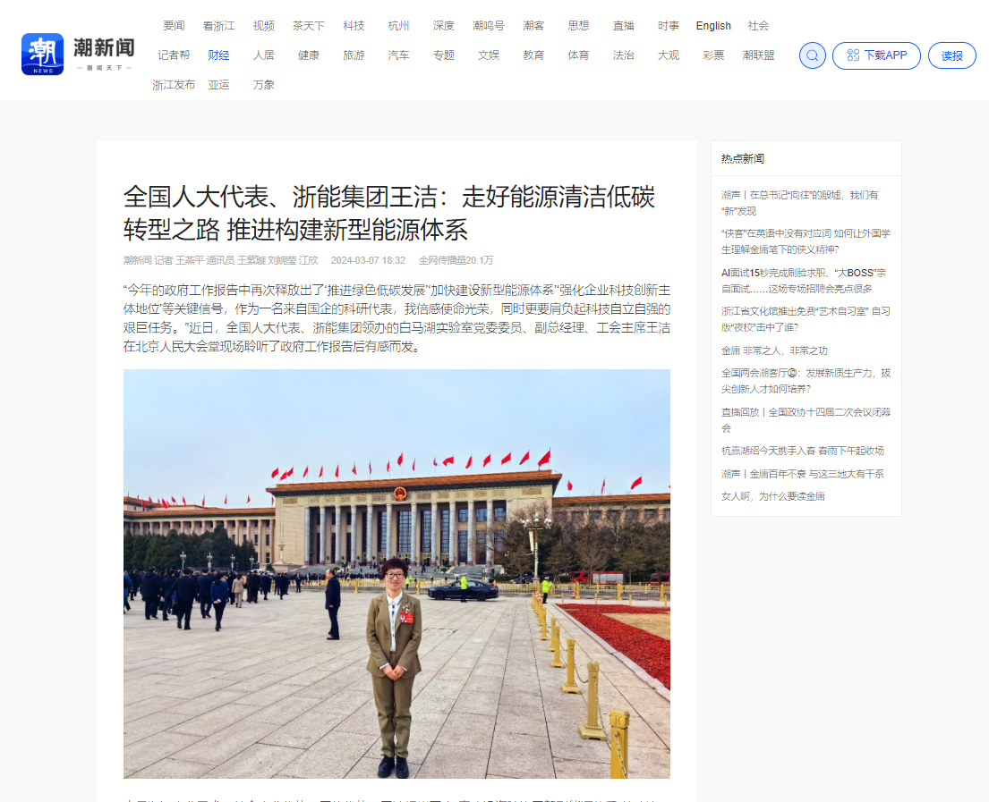 潮新聞客戶端報(bào)道《全國(guó)人大代表、浙能集團(tuán)王潔:走好能源清潔低碳轉(zhuǎn)型之路 推進(jìn)構(gòu)建新型能源體系》。 潮新聞客戶端 圖