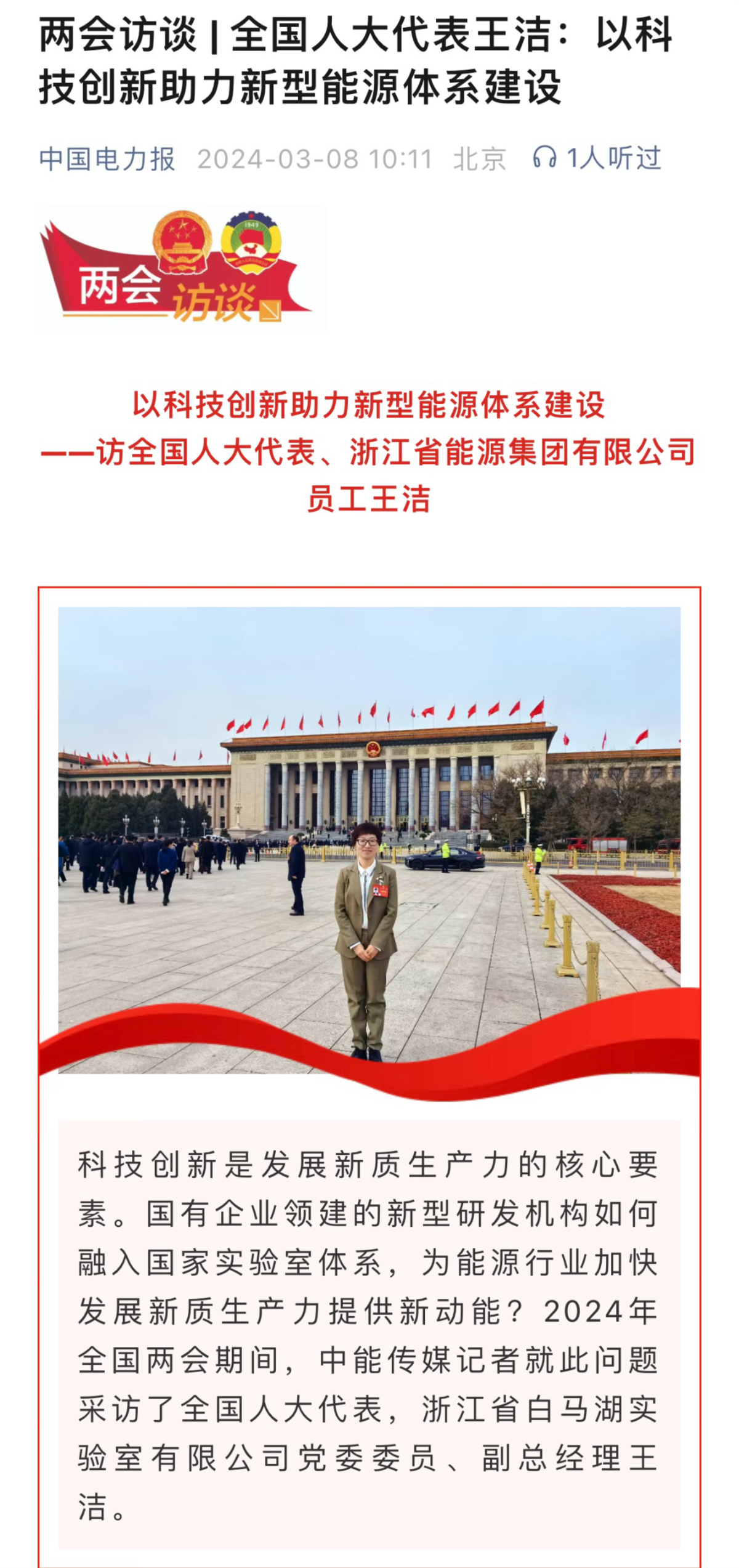 中國(guó)電力報(bào)報(bào)道《兩會(huì)訪談 | 全國(guó)人大代表王潔:以科技創(chuàng)新助力新型能源體系建設(shè)》。 中國(guó)電力報(bào) 圖