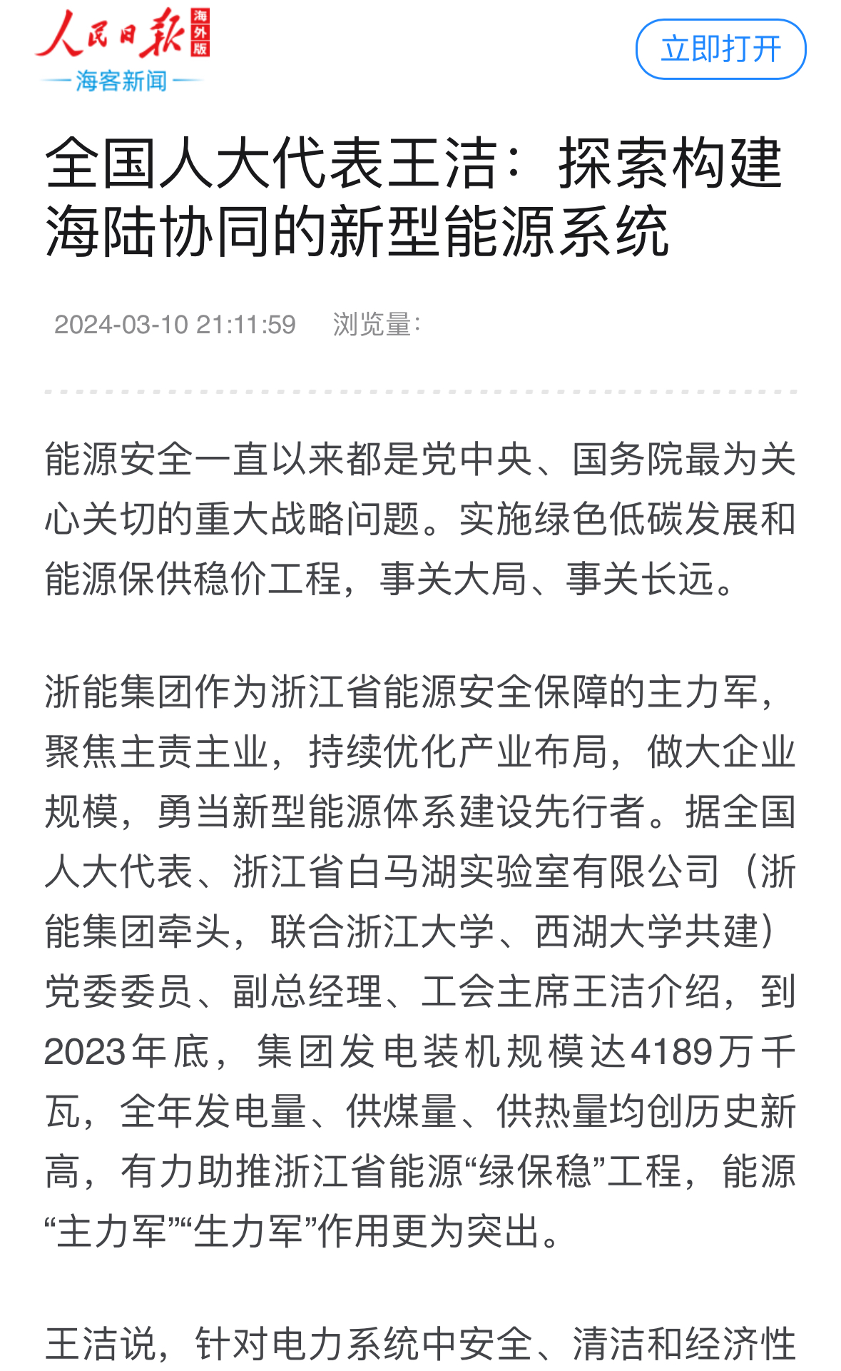 人民日?qǐng)?bào)海外版官網(wǎng)報(bào)道《全國(guó)人大代表王潔:探索構(gòu)建海陸協(xié)同的新型能源系統(tǒng)》。 人民日?qǐng)?bào)海外版官網(wǎng) 圖